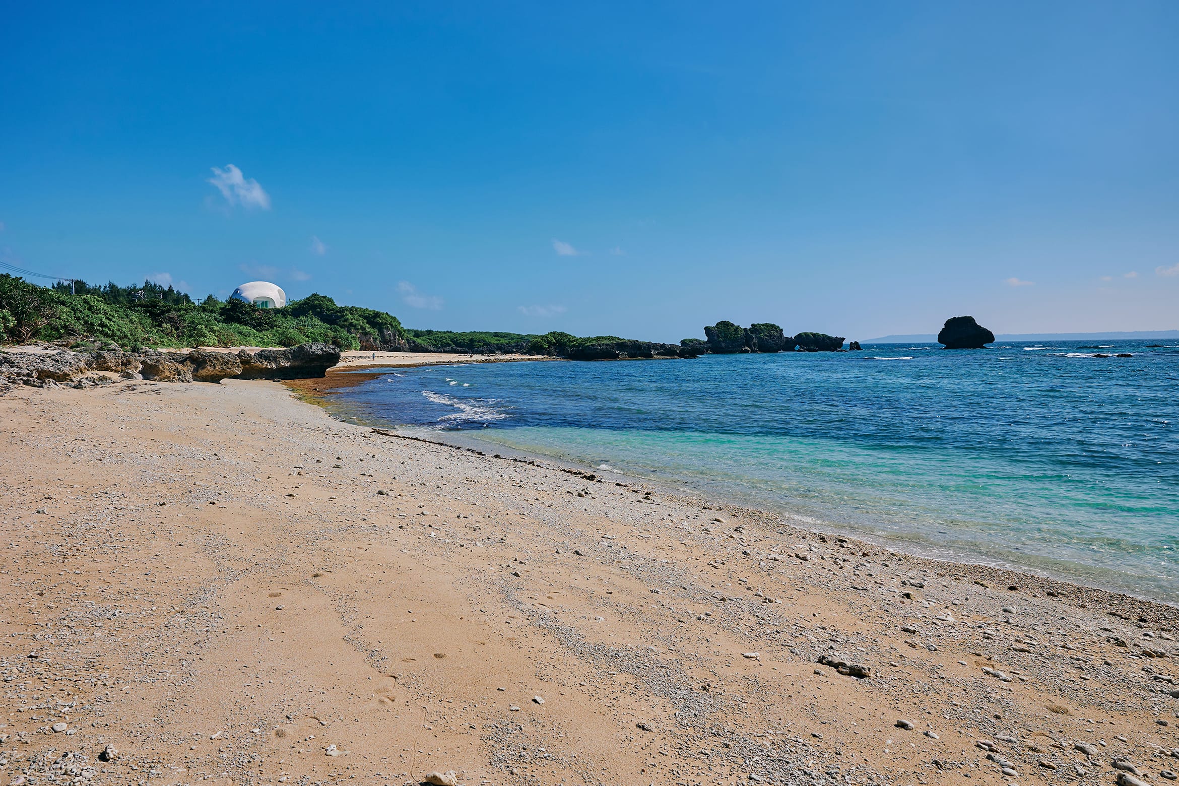 At the end of the walk, you will come across a pure white beach and see schools of small fish swimming in the calm Miyako blue water.